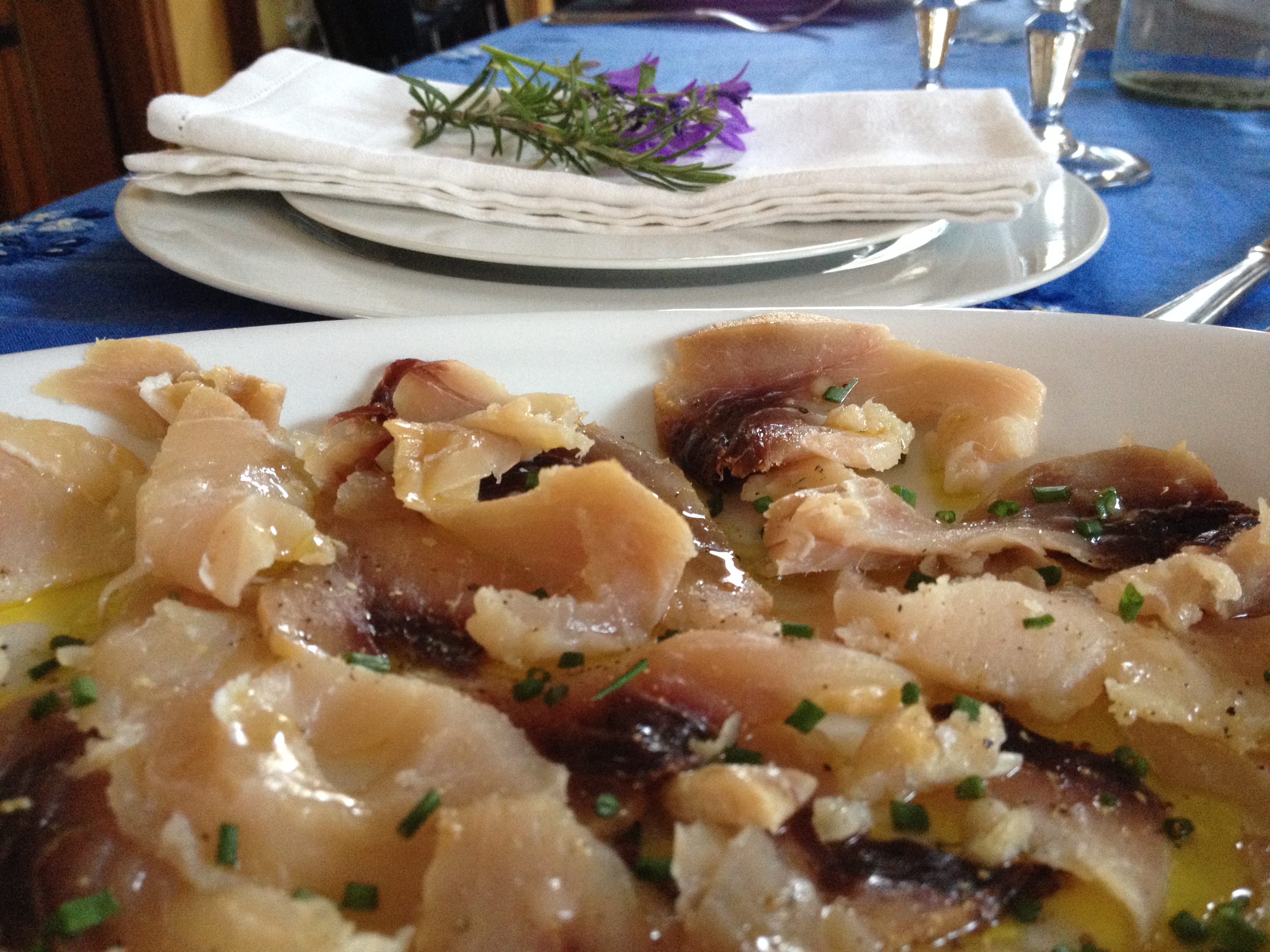 Disponete le fette di pesce spada su un piatto, condite con un olio, limone, erba cipollina, pepe. Mettete una goccia di miele per ogni fetta.