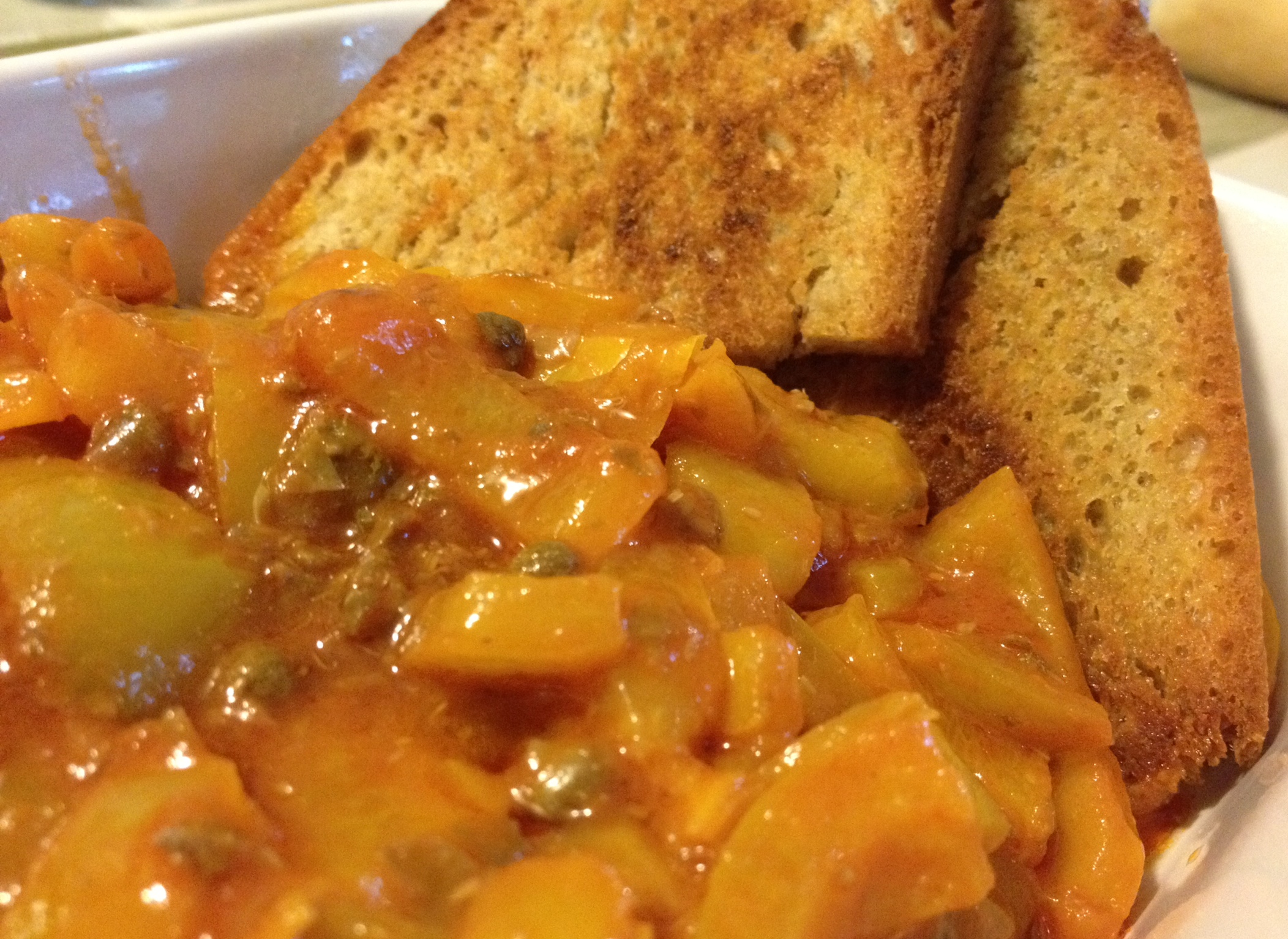 Unite un trito fatto con i capperi risciacquati e le acciughe. Fare insaporire, ed eventualmente restringere il sughetto, qualche minuto. Servite i peperoni tiepidi, accompagnati da fette di pane casereccio fritto nell’olio.