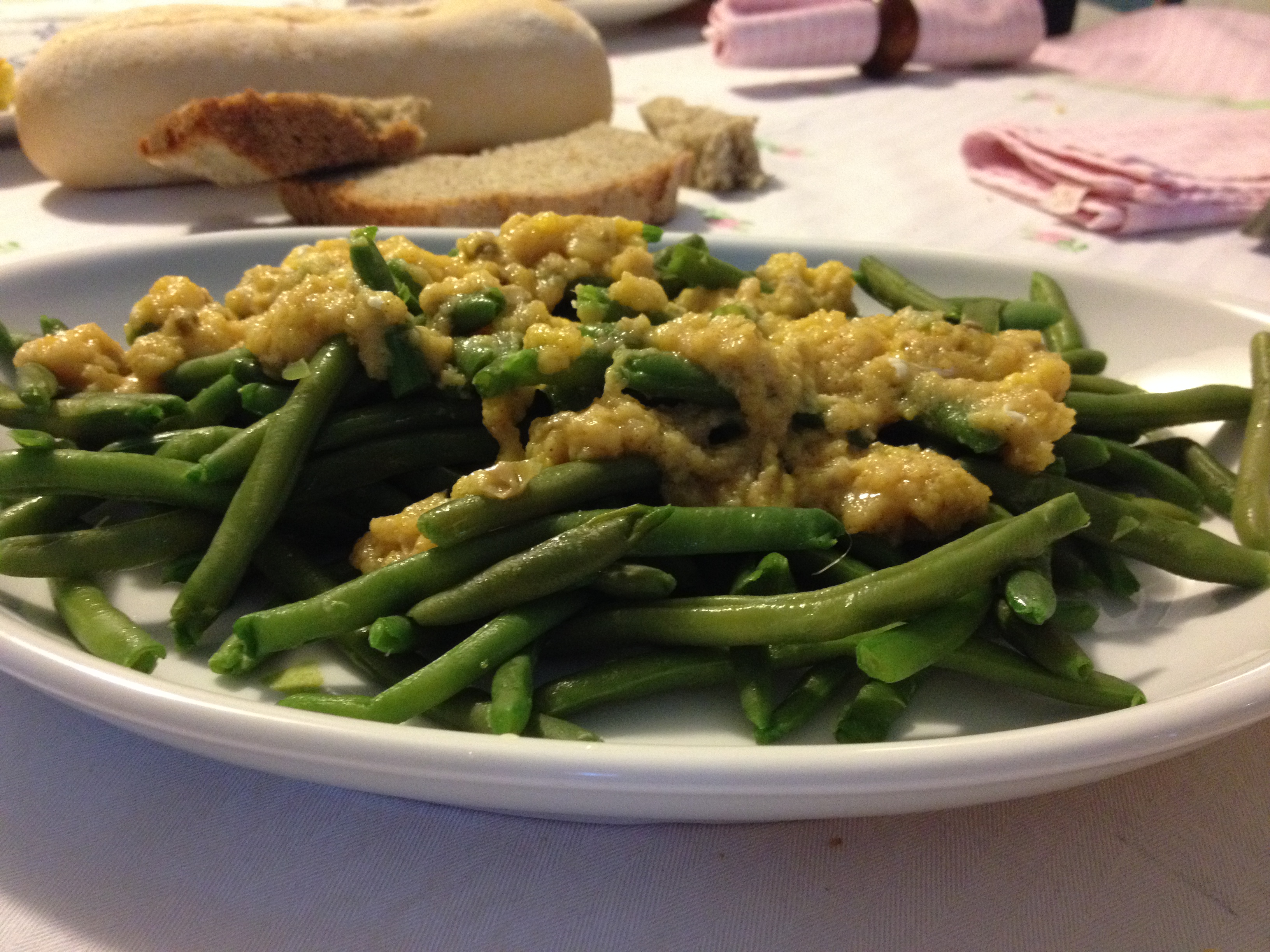 Aggiungete i capperi tritati, il tuorlo, il succo di limone ed infine lo zucchero, senza smettere mai di mescolare. Fate bollire lentamente, per pochi secondi, spegnete il fuoco e versate la salsa sui fagiolini.Amalgamate per bene i fagiolini alla salsa e servite.