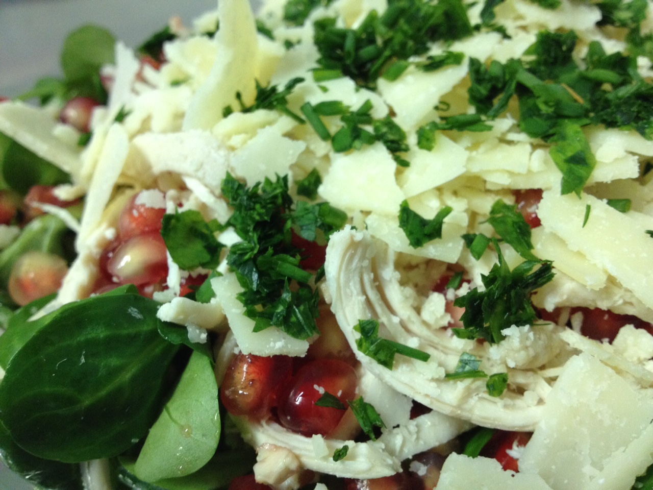 Boil the chicken cut in pieces for about 15 minutes. Take th e seeds out of the pomegranade, cut the parmesan in flakes and cut in thin pieces the chicken.