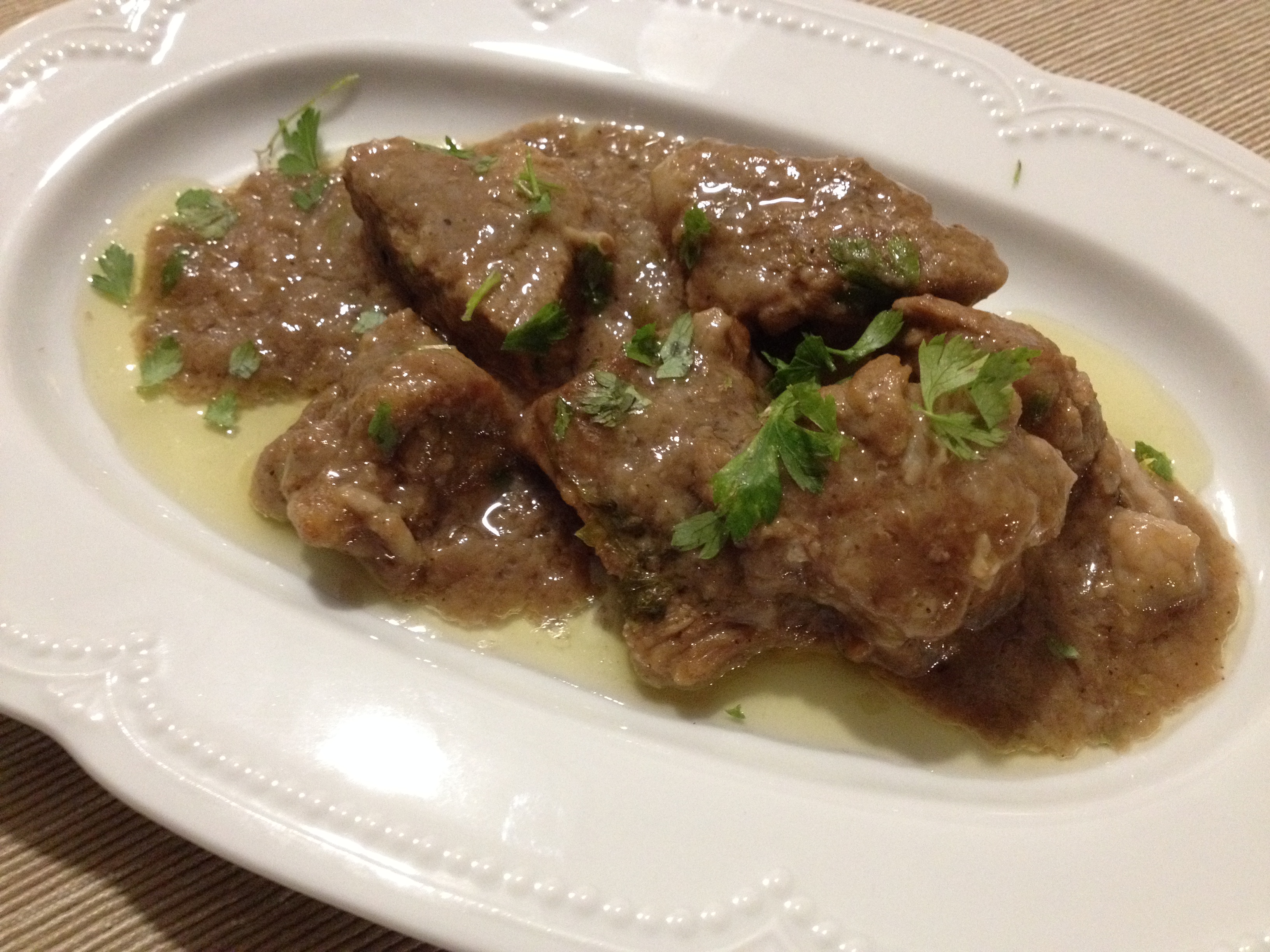In a heavy pan, heat 3-4 tablespoons of oil and the garlic; take them away when golden, add the meat and brown it well. Season with salt and pepper and add the marsala wine, 1 glass of water, 1 tablespoon of parsley. Cook covered at a low simmer for 1 hour and 45 minutes.