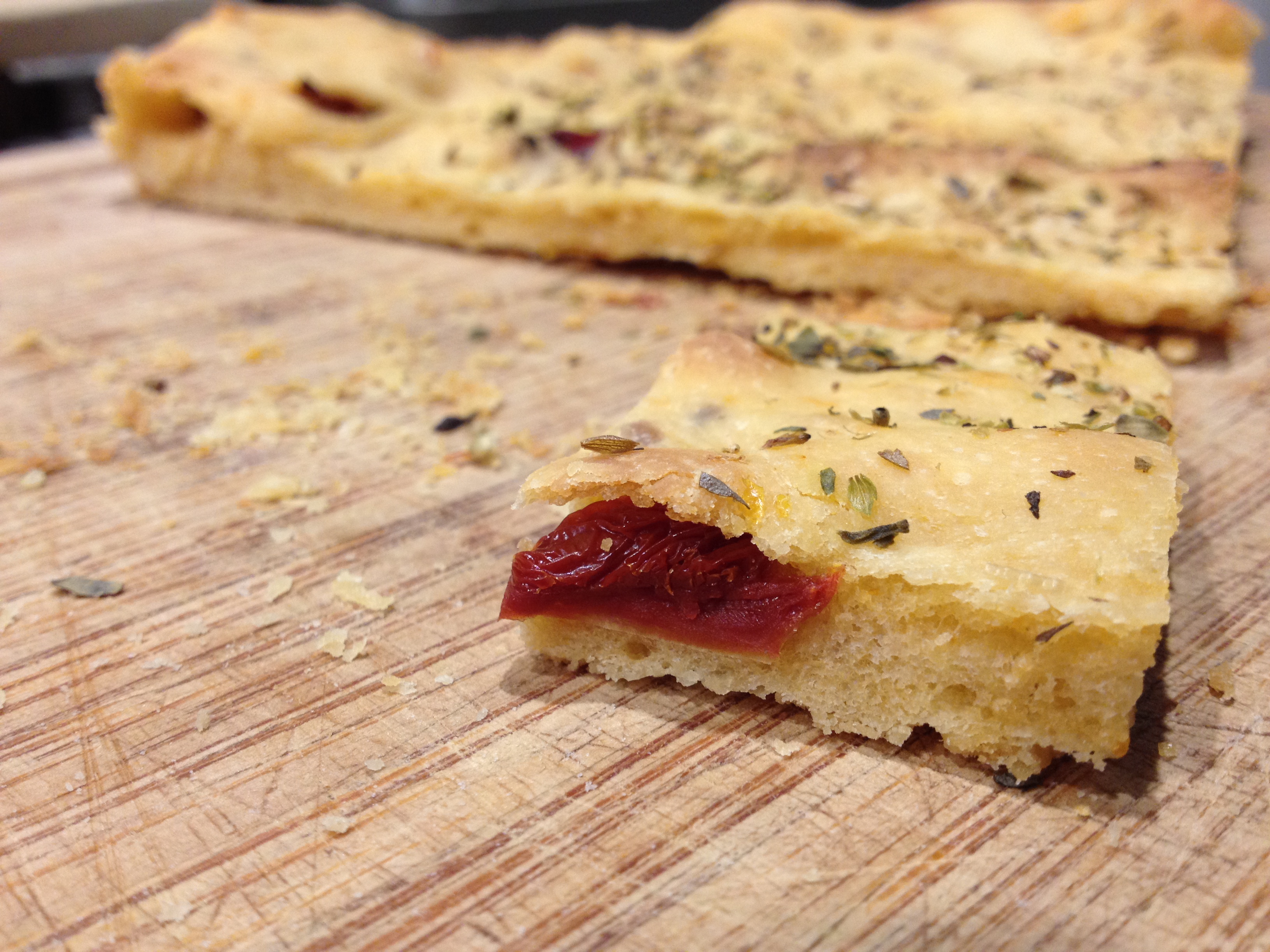 Impastate la farina e il lievito con metà acqua, aggiungete l’olio e i pomodori secchi. Impastate un poco e poi aggiungete il sale e quasi tutta l’acqua.