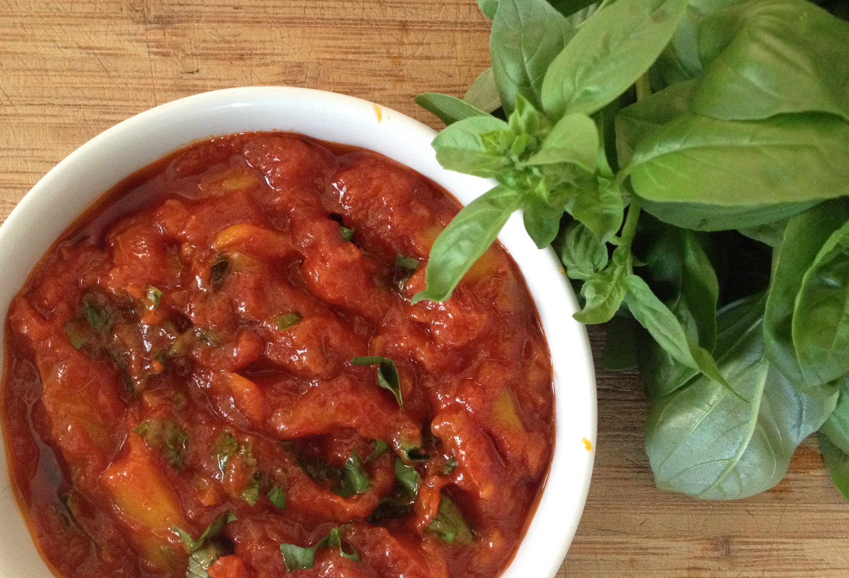 Cut the onions and peppers into strips. Cook covered for 30 minutes in a pan with 4 tablespoons of olive oil and half a glass of water . Add the tomato sauce , a handful of basil leaves and salt . Cook for 30 minutes with the lid and for another 30 minutes without adding 2 tablespoons of oil. At this point the peperonata is ready , but if you cook it longer it becomes even more tasty .