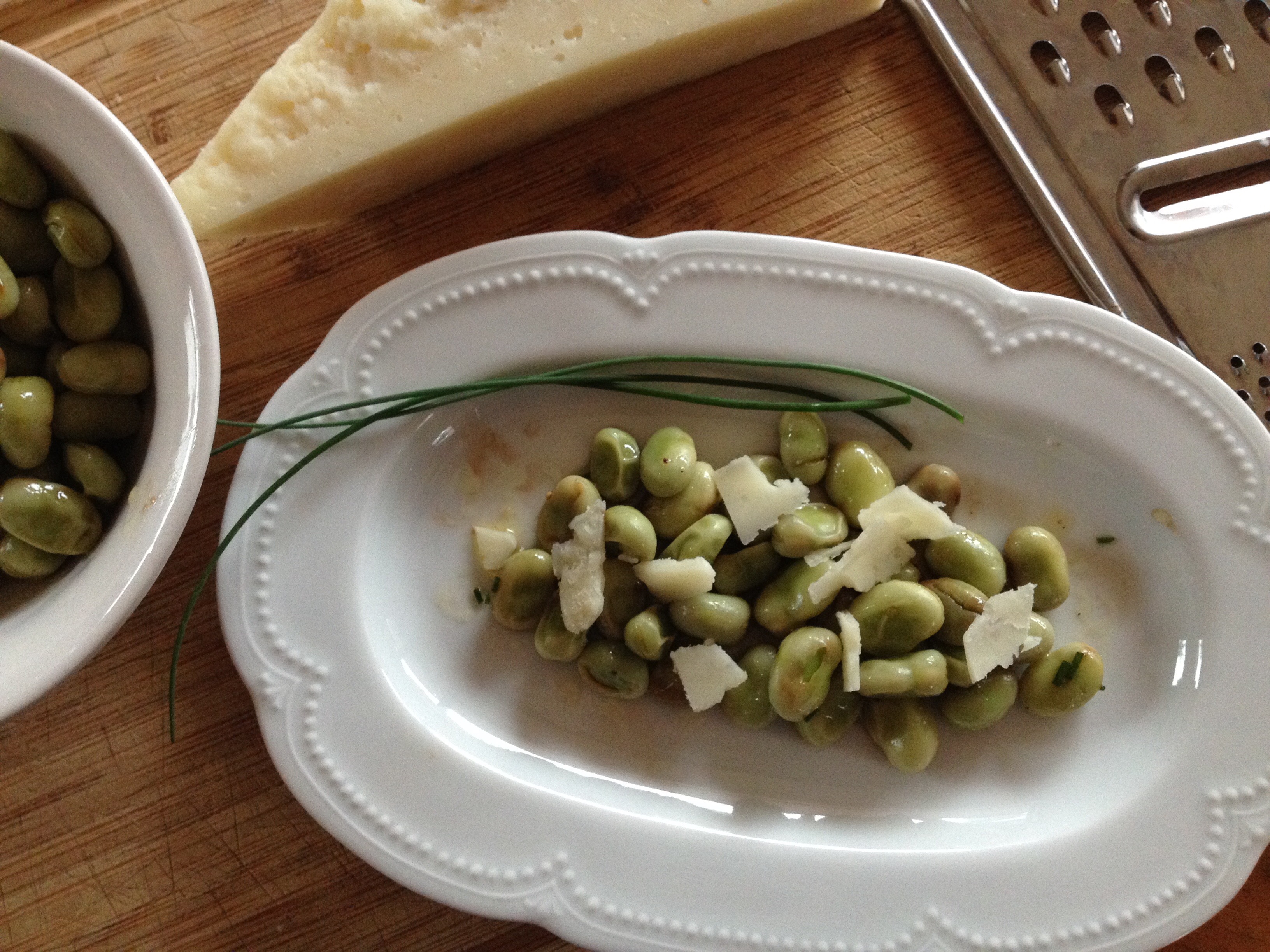 Condite le fave con 3 cucchiai di olio, 1 cucchiaino di aceto balsamico, l’erba cipollina tagliata a pezzettini, sale e pepe.