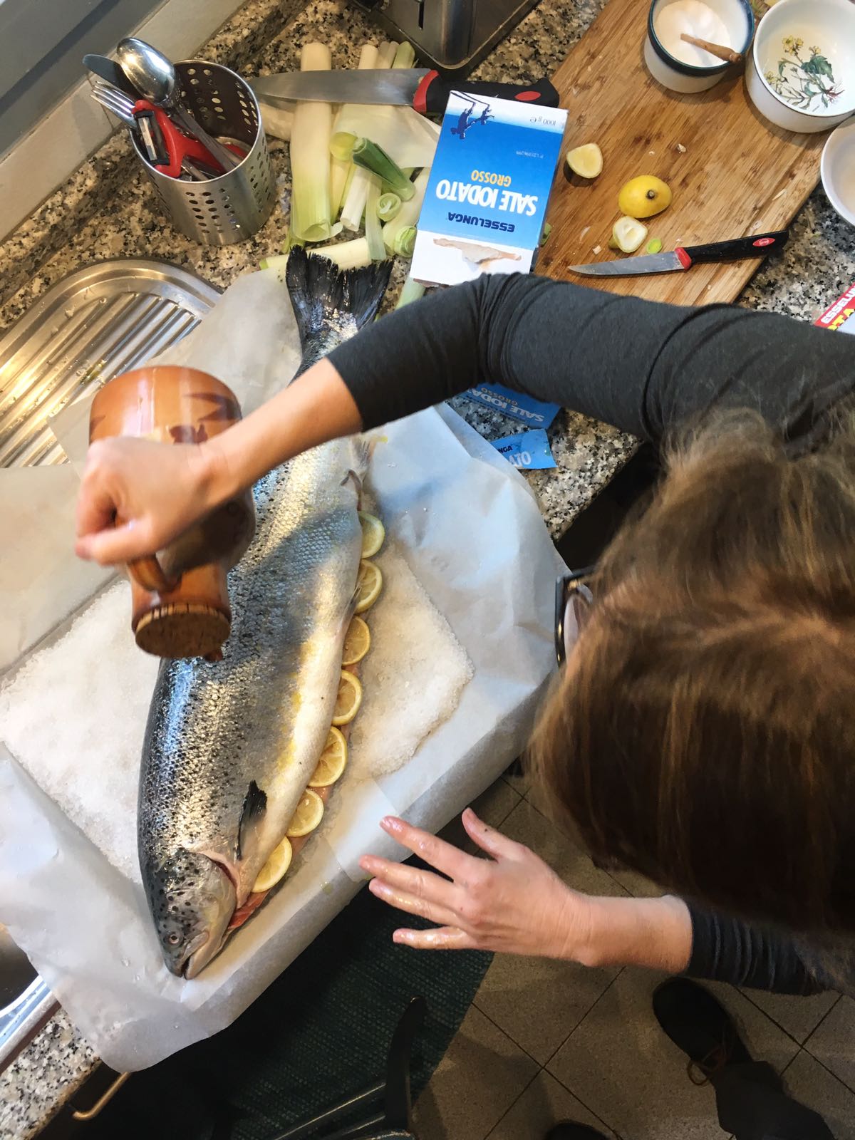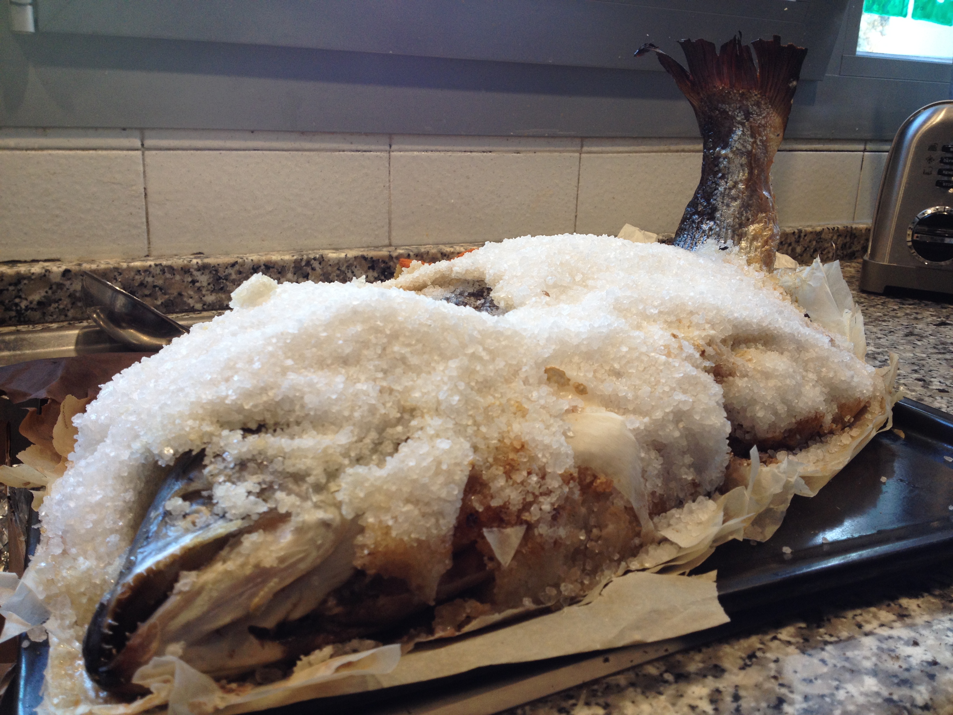 – If the fish is very big, you can make a kind of “boat” with baking paper, in order to use less salt: put long strips that come out of the fish on all sides and then pull up and close with a stapler the edges. Put the salt inside the “boat”.