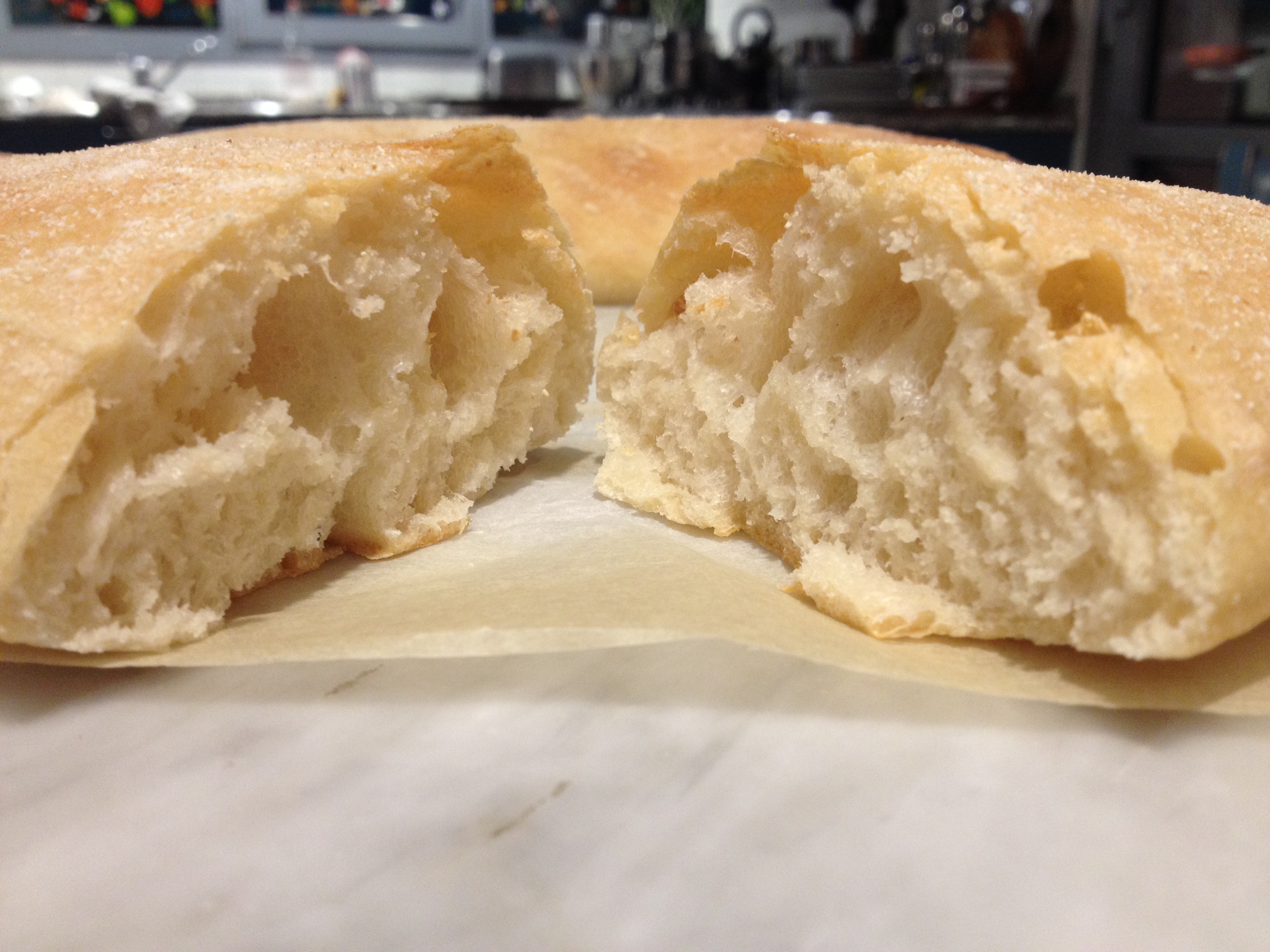 Dopo questo tempo si presenta ancora come un impasto piuttosto liquido e appiccicoso. Senza lavorarlo dividete in due, tirate a forma di filoncino e adagiate su una teglia coperta di carta da forno leggermente coperta di semola e fate un paio di incisioni per il lungo. Spolverizzate con un poco di semola. Fate ancora lievitare un paio di ore.