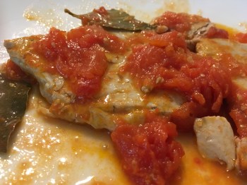 Heat 4 tablespoons of oil in a pan and arrange the tuna slices and bay leaves. Cook for about 3 minutes, then turn the slices and pour the wine. Let it evaporate and add the tomatoes and salt.