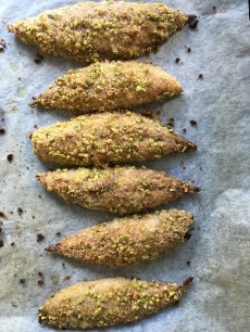Pour the grated bread and the pistachios on a dish, and mix them well. Drip the fillets well and coat with the bread and the pistachios. Lightly salt and pour little oil on each.