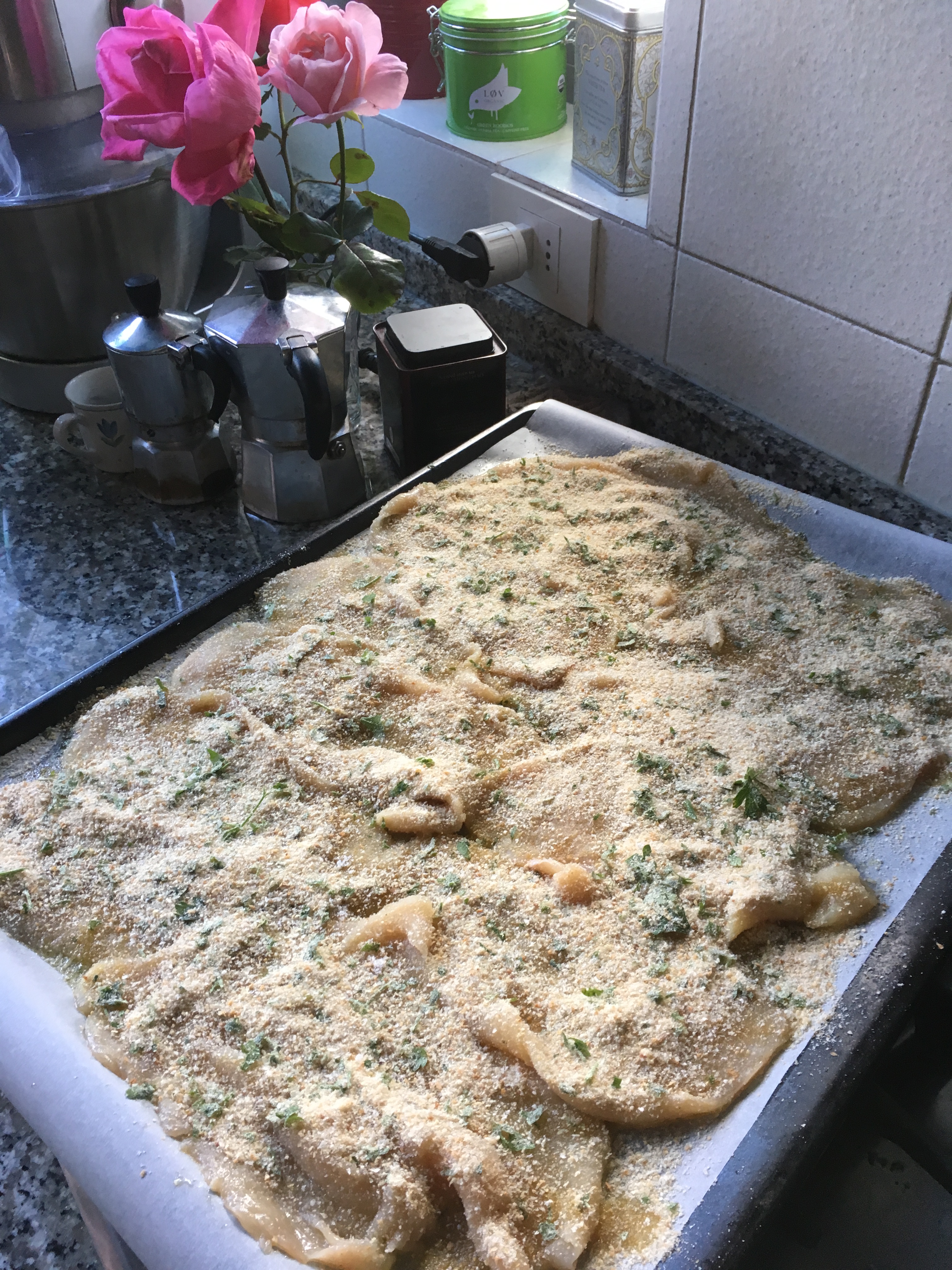 Oil the chicken slices and place them on a baking tray with baking paper. Salt lightly.