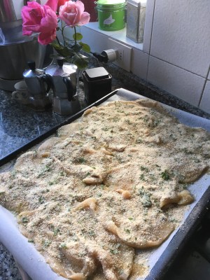 Mischiate il pane grattuggiato con il prezzemolo e un poco di sale. Coprite le fette con il pane grattuggiato e cuocete in forno a 175° per 15 minuti.