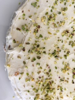 When the cake is cooled, cover with the icing and decorate with the pistachio grain.