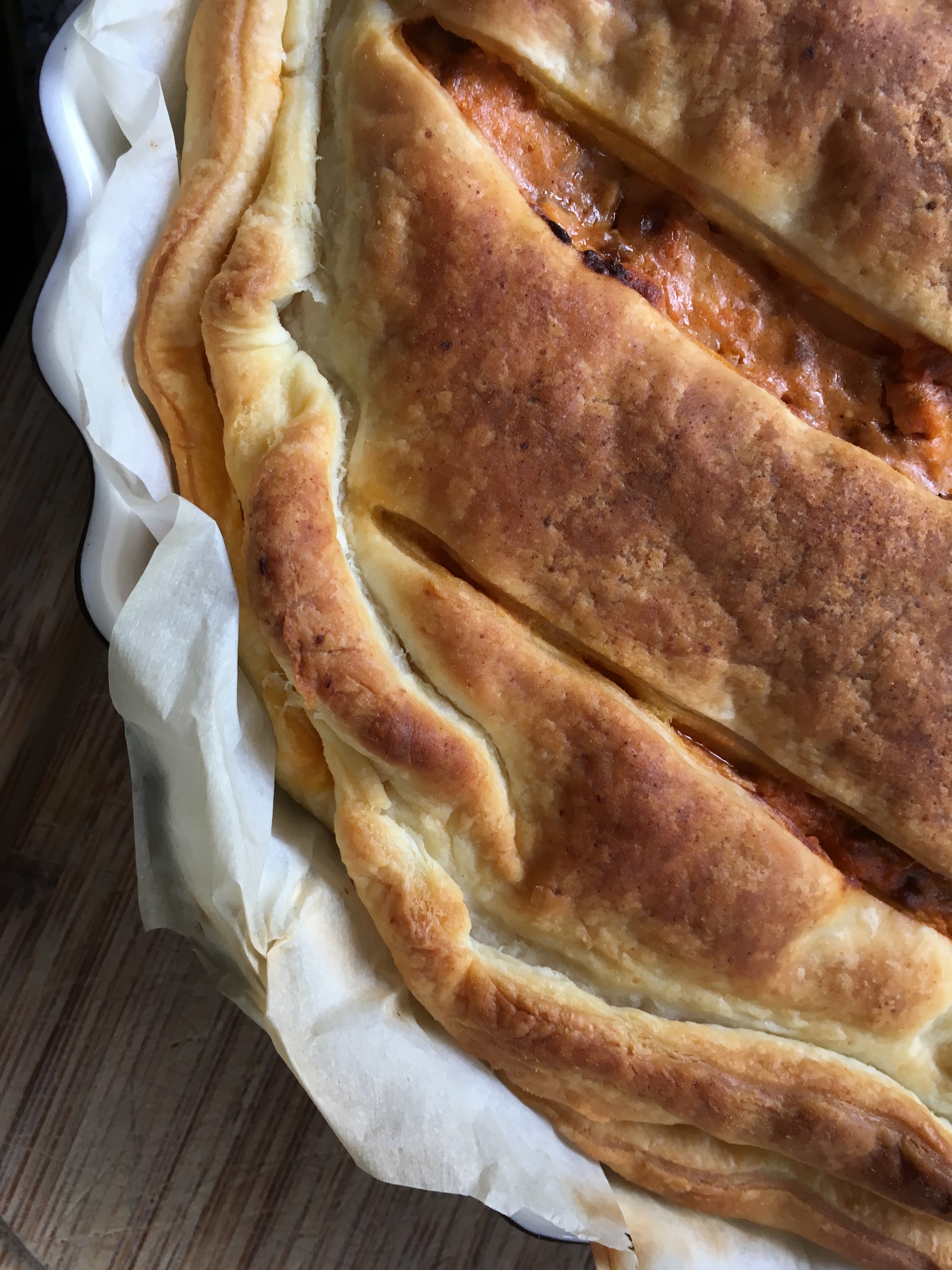 Stendete in una teglia una sfoglia. Versate il composto. Fate dei tagli lunghi nell’altra sfoglia e stendetela sopra , facendo aderire tra loro i bordi.
