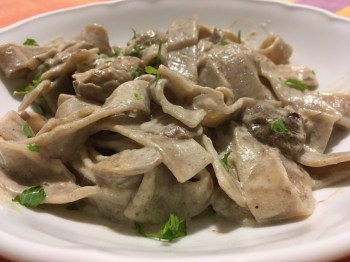 Meanwhile, heat 3 tablespoons of oil in a pan with the whole garlic clove, anchovy fillets and half parsley. Add the mushrooms and cook for about 15 minutes. Add the cream and mix well.