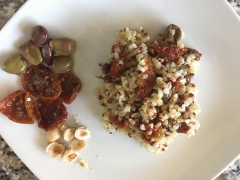 Burgul and quinoa with dried tomatoes, olives and hazelnuts