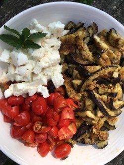 Put the eggplantss, cherry tomatoes, mozzarella, mint cut into small pieces and the garlic clove in a bowl.