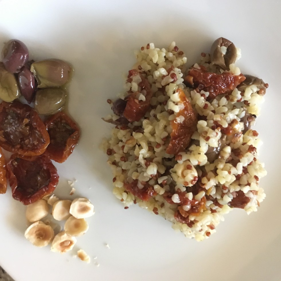 burgul e quinoa con pomodori secchi, olive e nocciole
